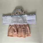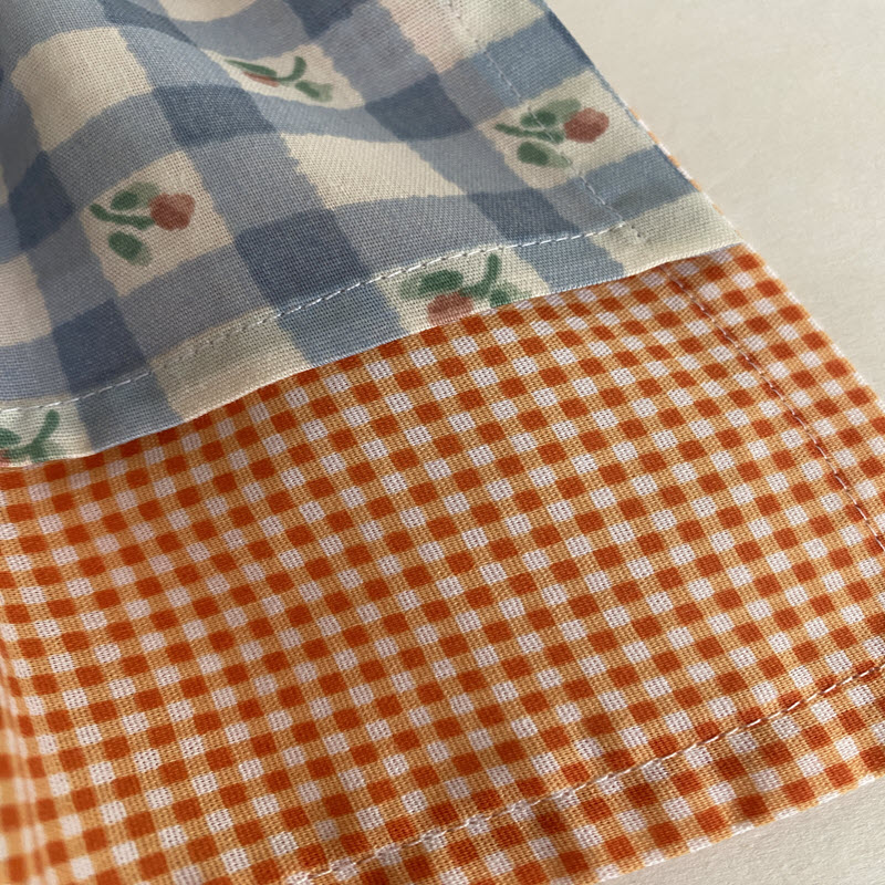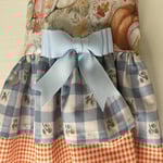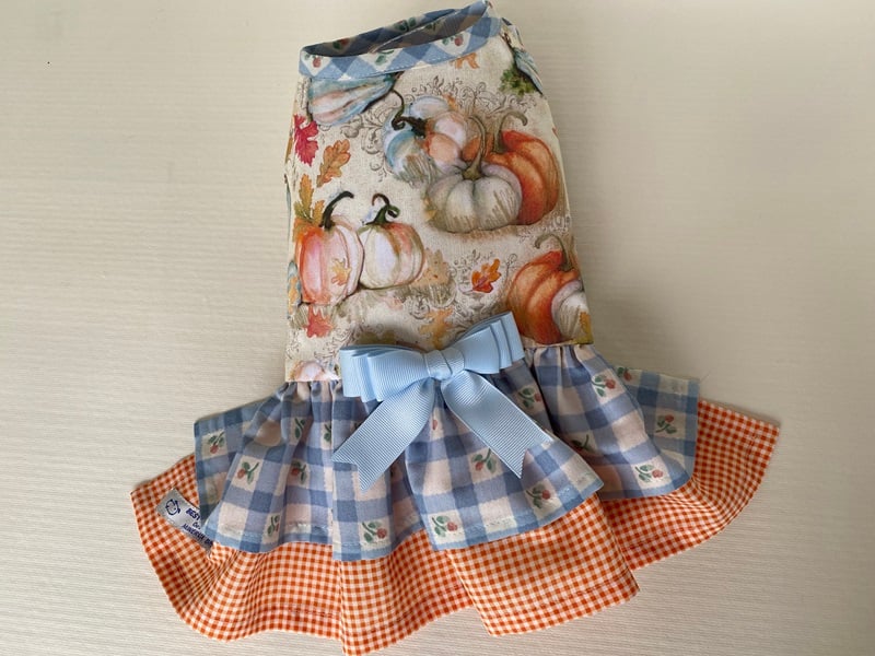 The top has a beige background with orange and white pumpkin and autumn leaves. double skirt with blue and white checkers and orange and white gingham. removable bow. Has a velcro closure.