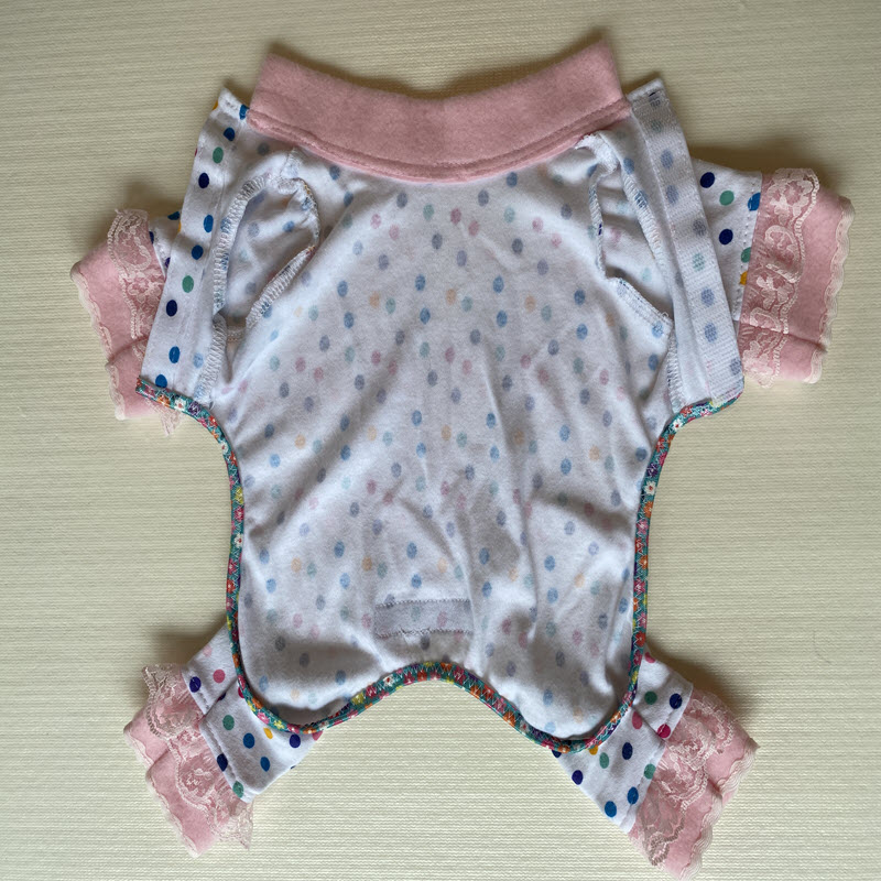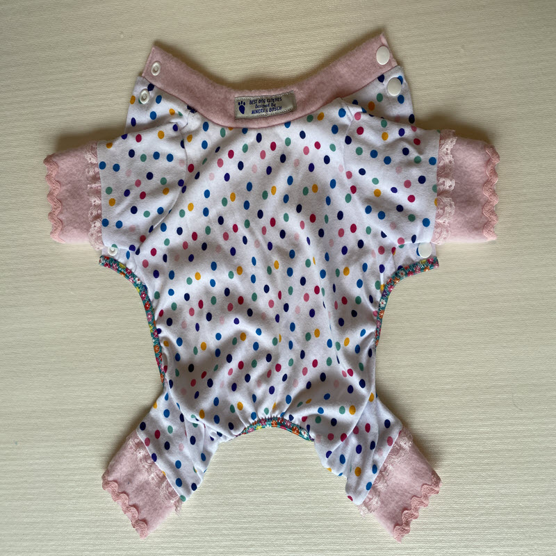 One of a kind double knit cotton with polka dots pajama. Velro closure