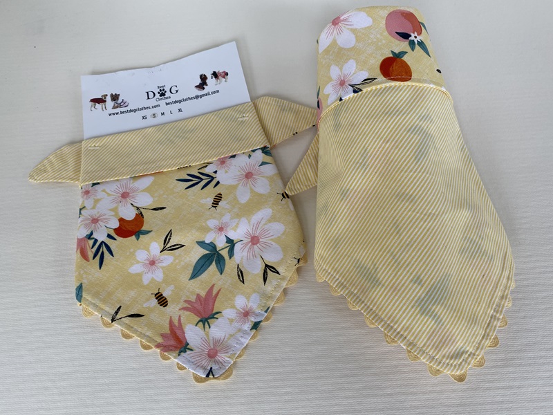 One of a kind Reversible Yellow with Peaches, Flowers, and Bumble Bees Tie Down Bandana